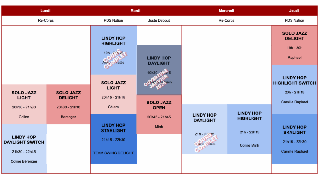 Les cours de Lindy Hop et Charleston en couple ont une durée de 1h15, tandis que les cours de Solo Jazz (Authentic Jazz) durent 1h. Nous avons pris soin d’élaborer des séances adaptées à chaque style, offrant ainsi une expérience complète et enrichissante.