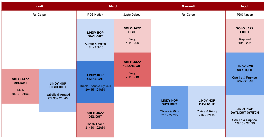 Les cours de Lindy Hop et Charleston en couple ont une durée de 1h15, tandis que les cours de Solo Jazz (Authentic Jazz) durent 1h. Nous avons pris soin d’élaborer des séances adaptées à chaque style, offrant ainsi une expérience complète et enrichissante.